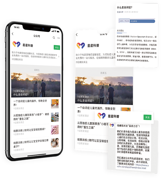 我们的使命是为星星儿童及家庭搭建有效的沟通渠道。包括特殊需求儿童的社交语言训练,社交训练, 认知理解,生活自理,感统训练等课程的免费教学, 为语言障碍儿童、发育迟缓儿童、孤独症儿童提供个性化的康复计划和选择,给更多的家庭带来希望和幸福。